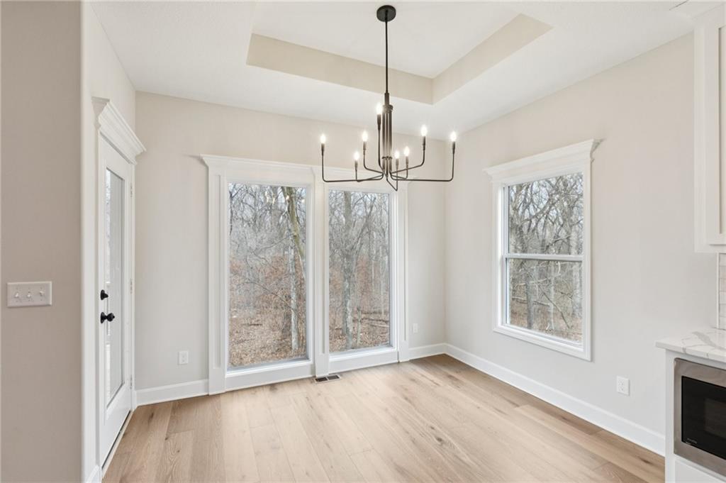 *COMPLETED AND MOVE-IN READY*ASK ABOUT BUILDER RATE BUYDOWN INCENTIVE* BEAUTIFUL LOT BACKING TO TREES! Introducing the "TAYA" by Robertson Construction! This Custom Reverse 1.5-Story sits on one of the most desirable lots you will find! Enjoy the peace and privacy from the Covered Deck and Patio at the Walkout Basement. Stunning 4 Bedroom, 3.5 Bath with an Open Layout and Floor to Ceiling Windows. The Main Level features Engineered Hardwood Flooring, Stone Fireplace accented with Floating Shelves and Built-in Cabinets, Kitchen Island, Quartz Countertops, HUGE WALK-IN PANTRY, Custom Cabinets and Drop Zone at Garage entry. Easy access to the OVERSIZED Deck from both the Breakfast Room and Master Suite which has a Walk-In Closet that conveniently connects to the Laundry Room. Also on the Main Level is a half bath and Bedroom 2 with an ensuite bathroom making it a cozy guest room or home office. The Lower Level is just as impressive with a HUGE Family Room, more Floor to Ceiling Windows, 2 more bedrooms, 1 Full Bath and a good amount of storage! Located in the highly-rated Kearney School District. Close to local amenities***ACTUAL PHOTOS OF HOME***